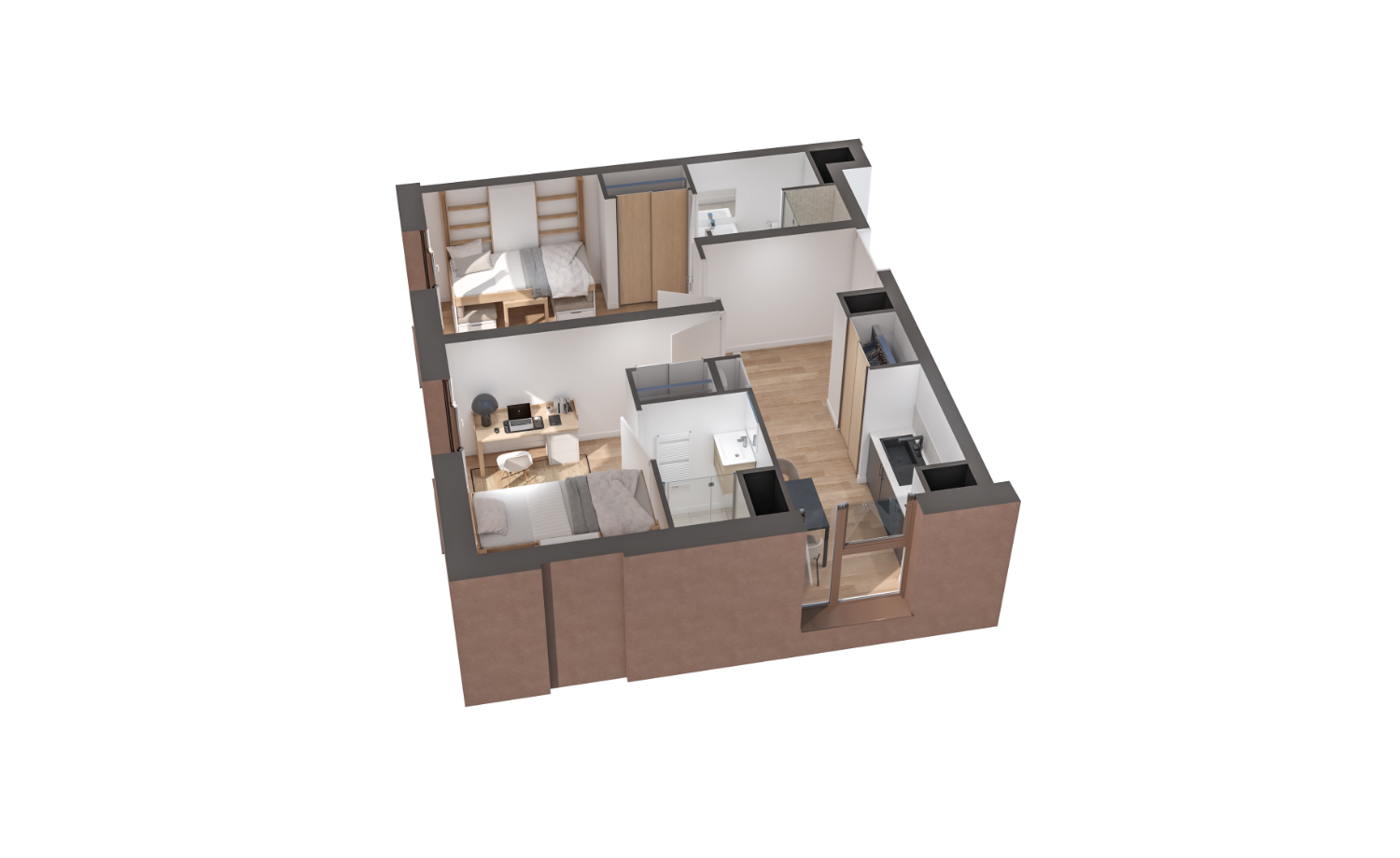 Kitchenette équipée (plaques de cuisson, micro-ondes, réfrigérateur), lit escamotable, table de repas, bureau avec fauteuil et rangements, armoire de rangement spacieuse, salle d’eau, connexion fibre haut débit, volets roulants électriques, revêtements de sols acoustiques font partie du pack aménagement de chaque logement. Du prêt à vivre moderne et confortable.